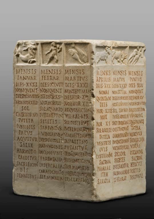 Farming calendar.  (Every side shows three months with the star signs, the number of days, hours of the day and night as well as the agricultural chores to be done. Roman, 1st century. AKG1002316 © akg-images / Rabatti & DomingieArchitecture