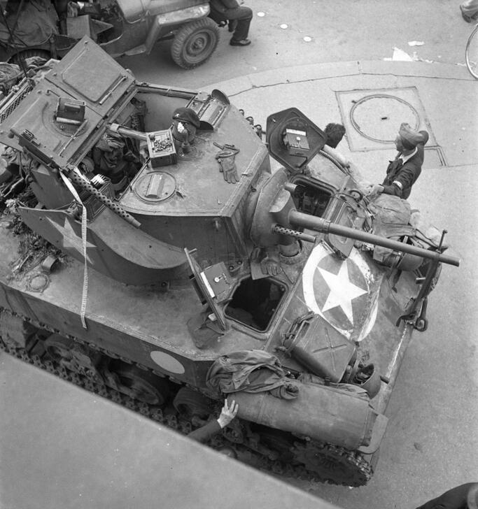 Young men and women climbed onto a tank of General Leclerc's 2nd Armoured Division to share their joy with the soldiers. AKG10778568 © René Zuber / akg-images